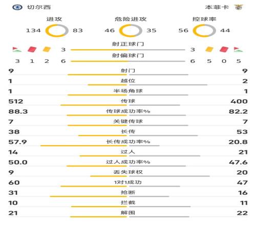 在过人方面,则反倒是本菲卡以21-14领先;过人成功率方面,则是切尔西以50%-47.6%稍稍领先。