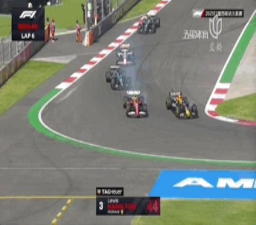 第6圈,维斯塔潘和汉密尔顿在一号弯发生碰撞,随后两人在四号弯依旧互不相让!汉密尔顿冲出赛道驶上草坪后没有通过赛事规定的线路返回赛道,依旧处于领先位置。乱战之下,维斯塔潘的比赛节奏受到影响,被身后的比尔曼超越跌至第5。而在他身后是安东内利和拉塞尔两辆梅奔。