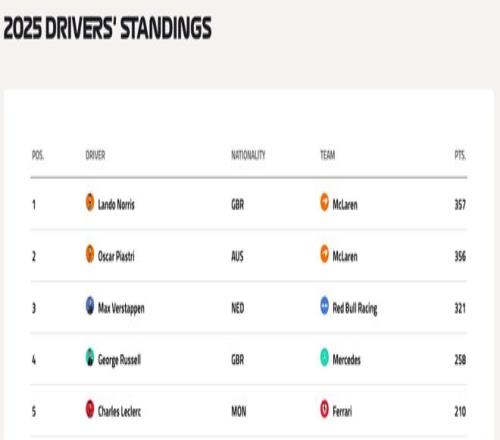 北京时间10月27日凌晨,2025赛季F1墨西哥站结束了正赛争夺!最终,诺里斯强势实现Pole to Win,由于他的队友皮亚斯特里最终以第五完赛,诺里斯拿到25分的同时超越队友1分暂时升至车手积分榜第一!