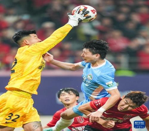 10月31日,成都蓉城队守门员刘殿座(左一)比赛中扑救。新华社记者 王曦 摄