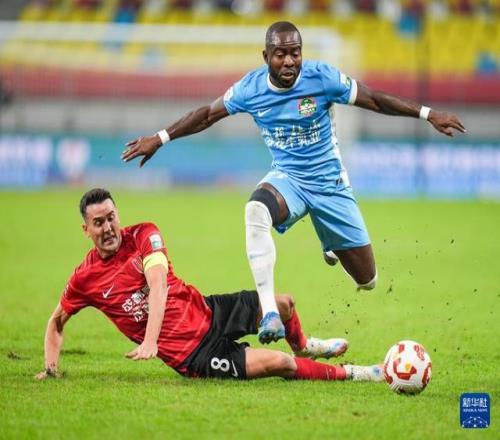 10月31日,成都蓉城队球员周定洋(左)与河南俱乐部酒祖杜康队球员阿奇姆彭在比赛中拼抢。新华社记者 王曦 摄