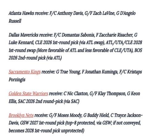 戴维斯加盟老鹰的交易不仅有可能达成,甚至可能演变成一场涉及多支球队的重磅交易。Sigele列出了一笔涉及老鹰、独行侠、国王、勇士和篮网的五方交易:戴维斯奔赴亚特兰大,特雷-杨、扎克-拉文、小萨博尼斯、克莱、库明加等多位球星也将牵涉其中。