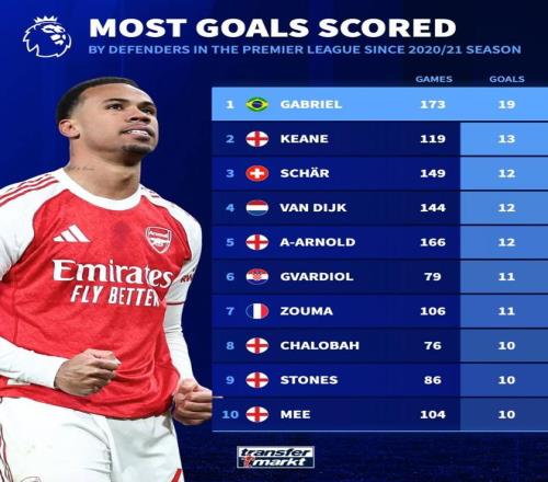 北京时间12月31日,德转统计了自2020-21赛季以来英超后卫进球榜,加布里埃尔以19球高居第一,范戴克、亚历山大-阿诺德、格瓦迪奥尔、查洛巴以及斯通斯上榜。
