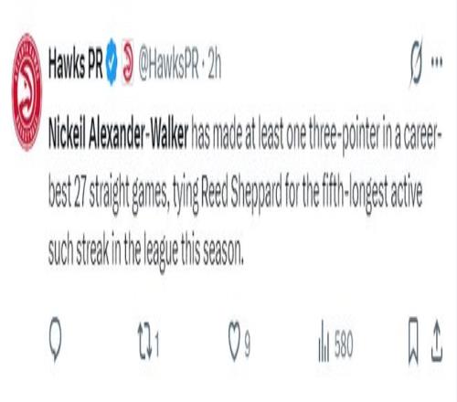 此役是沃克连续27场比赛至少命中一个三分球职业生涯最长,也跟谢泼德并列是联盟第五长。可以说沃克来到老鹰后真的步入巅峰期。