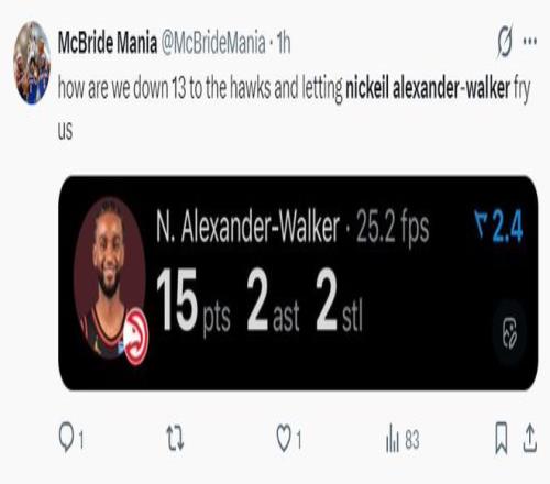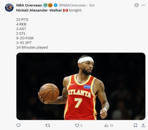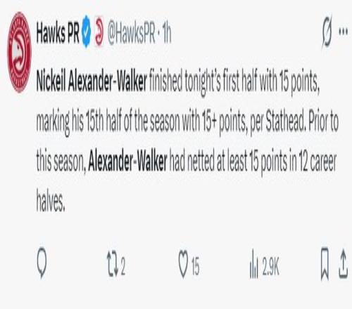 老鹰这边亚历山大-沃克发挥出色,他上半场11中6拿到15分2篮板2抢断。