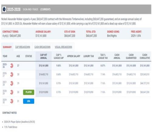 今夏老鹰用四年6060万从森林狼那里先签后换得到沃克,沃克本赛季只有1516万的薪水。