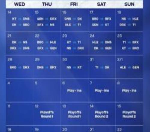 电竞体育1月6报道 LCK官方公布了2026LCK杯赛程安排,1月14日揭幕战KT vs DNS、DK vs BRO,焦点战1月16日HLE vs T1!