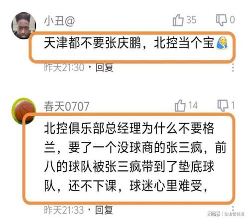 而北控队本赛季惨淡的战绩,也引来网友对少帅张庆鹏执教能力的质疑,纷纷吐槽道“天津都不要张庆鹏,北控当个宝”;“北控俱乐部总经理为什么不要格兰,要了一个没球商的张三疯,前八的球队被张三疯带到了垫底球队,还不下课,球迷心里难受”;“北控能不能把天津签转过来的都退回去,包括主教练。”;“北控不练防守吗?突破分球全是大空位,这教练就是个混子,快赶紧下课吧,把解立彬换回来。”;“张庆鹏真不如老闵呢。什么玩意。混乱至极。”。