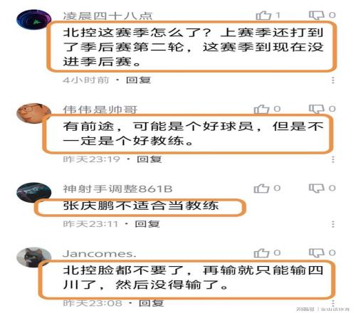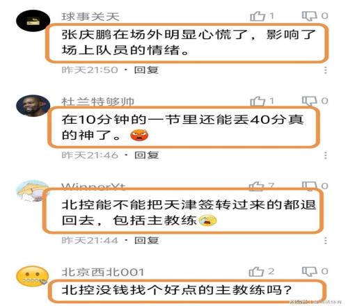 “北控这赛季怎么了?上赛季还打到了季后赛第二轮,这赛季到现在没进季后赛。”;“有前途,可能是个好球员,但是不一定是个好教练。”;“张庆鹏不适合当教练。”;“北控脸都不要了,再输就只能输四川了,然后没得输了。”;“张庆鹏在场外明显心慌了,影响了场上队员的情绪。”;“在10分钟的一节里还能丢40分真的神了。”;“北控没钱找个好点的主教练吗?”……