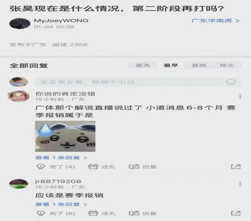 遗憾的是,张昊赛季报销了。据《广东体育》解说员透露,张昊受伤了,需要6-8个月的时间,这赛季赶不上。张昊本赛季只打了一场比赛,常规赛揭幕战主场迎战南京同曦,张昊打了20分钟,得到4分7篮板,还有3次抢断。此后,张昊就没有上过场,据悉这场比赛过后张昊就受伤了。