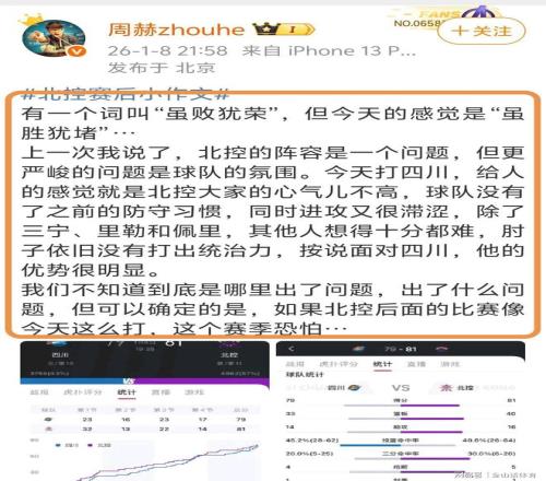 赛后,媒体人周赫zhouhe在社媒发文,点评了本场比赛。“有一个词叫“虽败犹荣”,但今天的感觉是“虽胜犹堵”…上一次我说了,北控的阵容是一个问题,但更严峻的问题是球队的氛围。今天打四川,给人的感觉就是北控大家的心气儿不高,球队没有了之前的防守习惯,同时进攻又很滞涩……按说面对四川,他的优势很明显。”。